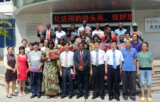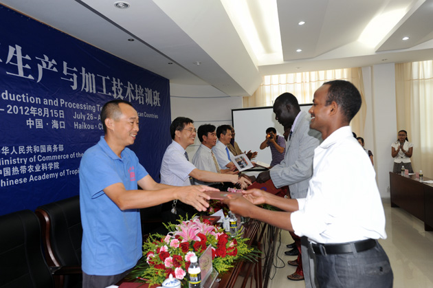 8月15日,非洲国家木薯生产与加工技术培训班在海口院区举行结业典礼。来自南非、加纳、桑给巴尔、乌干达、埃塞俄比亚、贝宁、布隆迪、利比里亚、尼日利亚、塞拉利昂10个非洲国21名学员获得了结业证书。