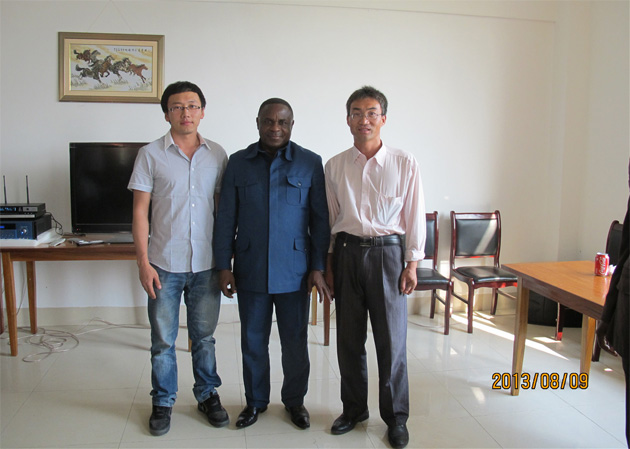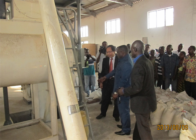 刚方农牧业部部长马本 杜强调了本期培训班的重要意义,要求学员们多与中国专家学习交流,努力学好种植技术;中方专家组组长周泉发对来宾和学员们表示热忱欢迎。随后,大家参观了示范中心饲料加工设备,并现场观摩了生产过程。部长饶有兴致地询问了设备运转状况、操作程序、原料来源等。当他了解到这套设备每小时可生产4吨饲料的时候,感到非常吃惊,并询问了如何解决饲料包装袋等问题。