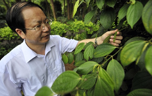 4月25日,王庆煌在兴隆热带植物园检查胡椒生长情况。郭程 摄