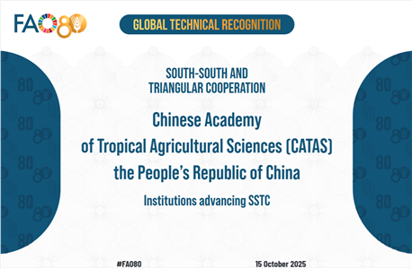 多年来,中国热科院在政策规划、知识分享与能力建设等多个层面与FAO保持密切合作,积极为FAO主办的热带农业平台、世界香蕉论坛提供专业知识。2014年,中国热科院被认定为FAO“热带农业研究培训参考中心”;2021年,双方签署《谅解备忘录》,进一步深化战略合作;自2022年起,中国热科院深度参与FAO“一国一品”特色农产品全球行动,并有7名专家被授予作物领域首席专家荣誉证书。中国热科院获奖,不仅是对中国热科院科研实力的国际认可,更是对中国在全球热带农业领域推动可持续发展的充分肯定。