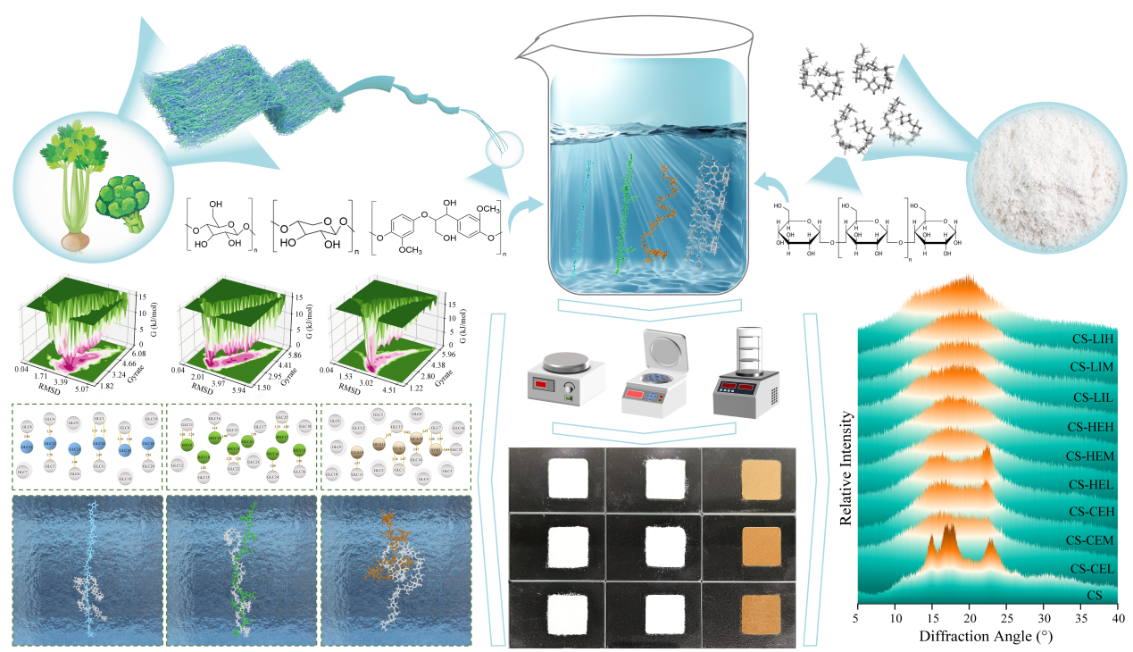 近日,中国热科院香饮所加工与工程技术研究团队在三种常见膳食纤维对木薯淀粉性质影响及互作机理的研究方面取得新进展。研究团队通过多重表征阐明了三种常见膳食纤维—纤维素、半纤维素、木质素对木薯淀粉理化性质及消化性影响。此外,研究团队根据核磁数据和前人结构信息构建了三种膳食纤维的分子模型,通过分子动力学在微观分子水平上揭示了膳食纤维与淀粉的分子相互作用机理,同时采用等温滴定量热法在宏观物理水平上进行验证。