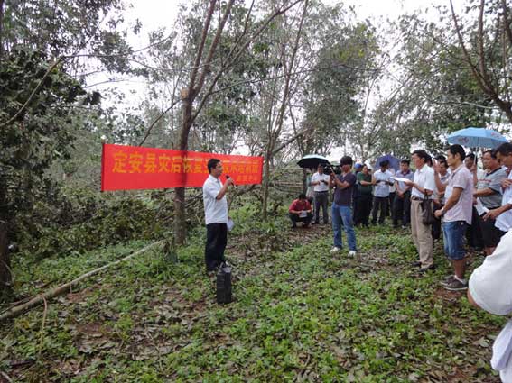 据统计,定安县种植橡胶15万亩,受灾面积12万亩,绝收面积4万亩。“抗风救灾小组”在定安县富文镇农户叶秀民的橡胶林里,开设了灾后恢复生产技术培训班,根据橡胶树不同的受灾情况,有针对性地指导和帮助当地农民开展生产自救,尽量挽回风害带来的损失。
