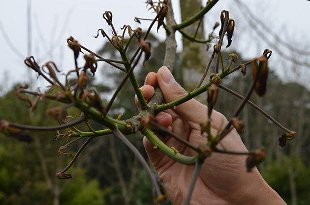 今年我省冬季温度较高,橡胶树抽叶较早,但是,受到2月中下旬寒流的影响,部分市县橡胶树新叶出现不同程度冻伤现象,由于寒流持续时间不长,加之橡胶树还处于萌动期,因此,并未对我省橡胶树新叶造成太大的影响。