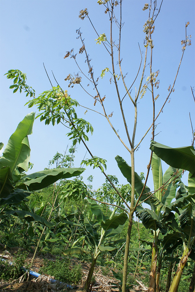 经现场观察,发现白沙分公司部分橡胶树幼苗出现顶芽枯萎、侧芽多发,同时伴有炭疽病和白粉病等症状,尤其在香蕉间作区域更为严重。根据这一情况,初步诊断根源为缺磷。这主要是由于该区域土壤母质为砂页岩,具有富钾低磷特征,加上间作香蕉钾肥施用量大,施入的钾肥易被橡胶幼苗吸收。钾素含量过高,破坏钾磷养分平衡,从而加重橡胶树幼苗“缺磷”现象;另一方面,由于橡胶树幼苗养分失衡,长势衰弱,容易受到病菌侵染,从而引发白粉病、炭疽病危害。针对这一情况,专家建议尽快以水肥形式增施磷肥,同时加强病害防治,促使胶苗尽快恢复正常生长。