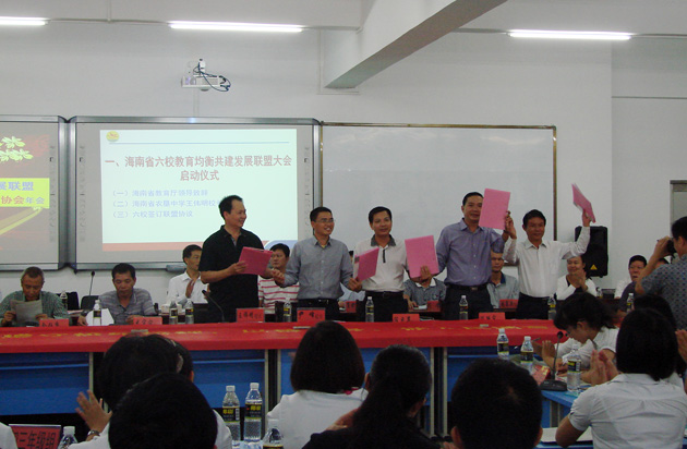 教育联盟六校分别是海南省农垦中学、热科院附中、海口市城西中学、海口市琼山二中、海口市长流中学、海口市东山中学。海南省教育厅高度重视此项工作,在联盟启动仪式大会上,廖清林副厅长专门发来贺辞。农垦中学王伟明校长代表联盟作重要讲话。在大家热烈的掌声中,六所联盟学校现场签订共建联盟协议。协议主要有八项内容:1.落实六校共建联盟五年发展规划;2.认真履行联盟学校校长联席会议制度;3.合作开展教育教学以及学校管理研究;4.进一步完善师资队伍的建设以及校本培训工作;5.有组织有计划地进行教育科研及其成果的交流推广;6.校本课程的合作研发;7.“团队合作、自主管理”有效课堂教学经验的总结交流;8.共同建立学生夏令营的社会实践活动课程。协议的签订标志着六校联盟正式成立。