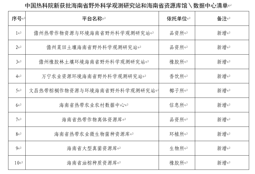 近日,海南省科技厅公布了省级基础支撑与条件保障类科技创新平台首批认定名单。中国热科院共12个平台获得支持,其中新获批10个,包括5个野外科学观测研究站和5个科技资源库/科学数据中心,尤其“海南省热带农业农村数据中心”是目前唯一布局的省级科学数据中心,另有2个中国热科院建设的“海南儋州热带农业生态系统国家野外科学观测研究站”“国家热带植物种质资源库”国家级平台也被纳入海南省支持范围。