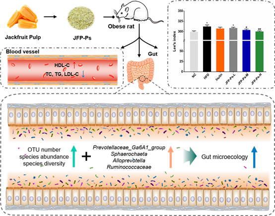 相关研究成果以“Polysaccharides from Artocarpus heterophyllus Lam. (jackfruit) pulp alleviate obesity by modulating gut microbiota in high fat diet-induced rats”为题发表于《Food Hydrocolloids》。中国热科院香饮所联合海南大学培养硕士曾顺江和海南大学曹君副教授为该论文共同第一作者,中国热科院香饮所朱科学副研究员和谭乐和研究员为论文通讯作者。