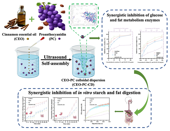 近日,中国热科院加工所食品加工研究室团队在天然活性物质自组装及其协同调控糖脂消化研究方面取得新进展。研究团队创新性地提出利用肉桂精油(Cinnamon Essential Oil, CEO)与原花青素(Proanthocyanidins, PC)自发形成纳米级胶体分散液(CEO-PC-CD),该体系无需任何表面活性剂或合成载体,实现了“清洁标签”条件下的稳定自组装。